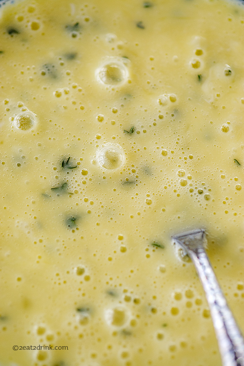 Make your egg batter for the french toast with several egg whites, only one egg yoke, a dash of milk, a little salt and pepper, and thyme.