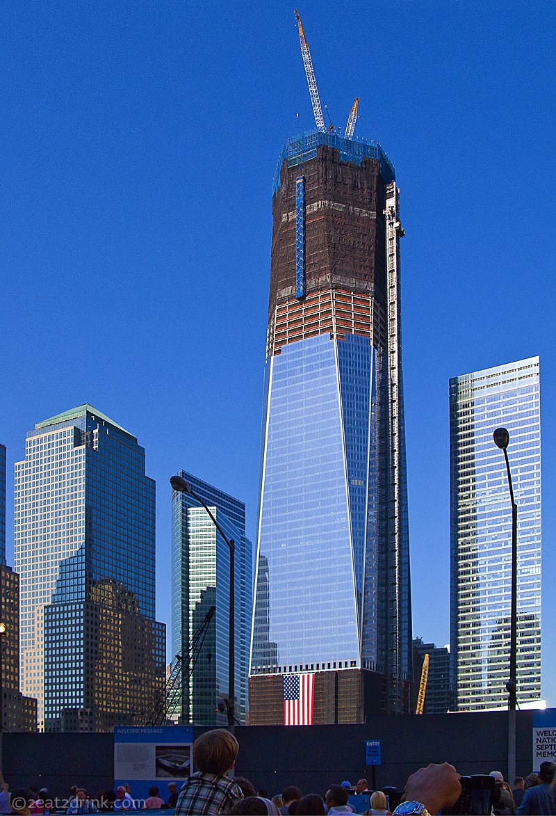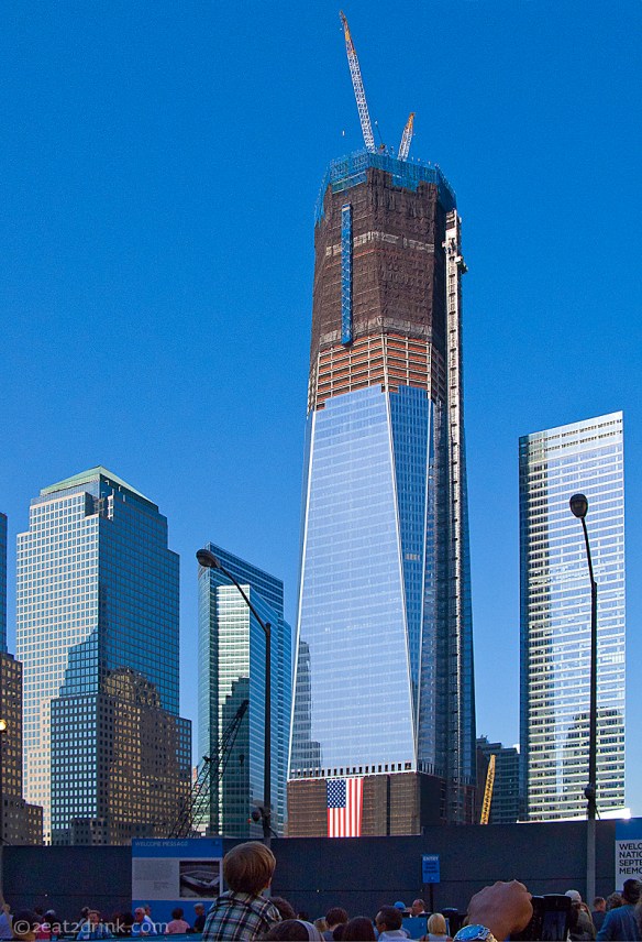 Satiated, we walked off our meal by strolling all the way to the new WTC complex. I worked at the World Trade Center, briefly, prior to the 9/11 attacks, and have always felt a need to make the pilgrimage back. Not knowing that it was necessary to make reservations to visit the actual 9/11 Memorial, we had to content ourselves with visiting the area. We walked the perimeter around the construction fences, visiting such 9/11 survivors as St. Paul’s Chapel and O’Hara’s Pub. We joined the masses watching the construction of the Freedom Tower, the new 1 World Trade Center. It was, as my mom put it when I texted her the picture, “a shining testament to the American spirit.”